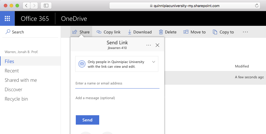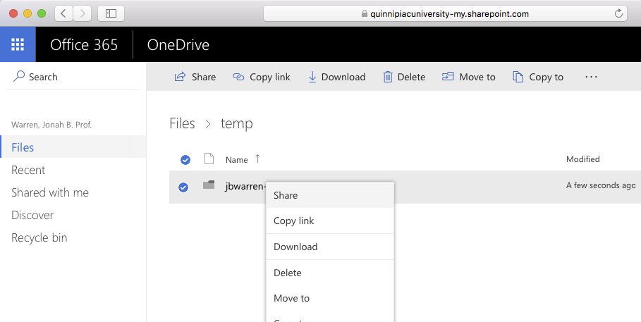 OneDrive is a cloud-based storage service available to all students at Quinnipiac. You can share a folder with other students and faculty at Quinnipiac. They will have complete read/write access to the folder. Here's an overview of the process: